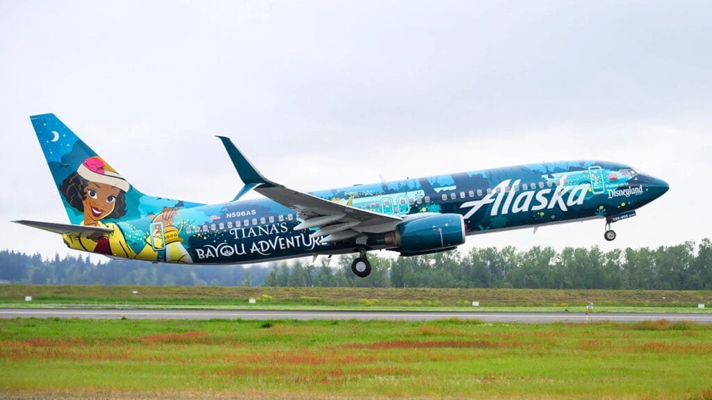The new livery first took to the skies from Portland International Airport for Santa Ana, California. Its design pays homage to “The Princess and the Frog” from Walt Disney Animation Studios and the water-based attraction at the park, and took artists more than 2,000 hours to paint, Alaska Airlines said.